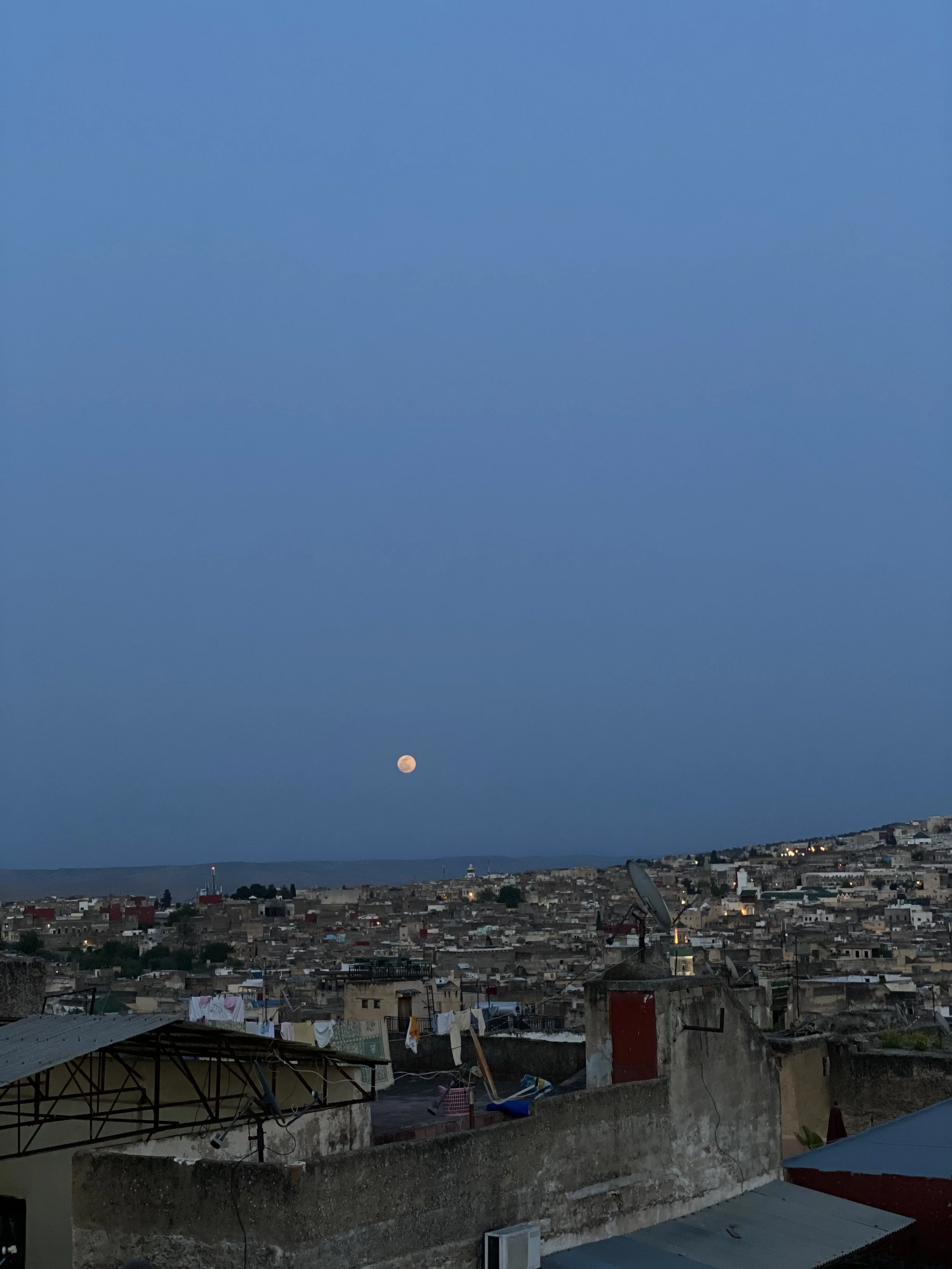 当然,我们的理查德以完全不同的形象出现,他掌握着多国语言,接待着大把来自欧洲的游客,时代之于他应该是沧海桑田般的变化,但我从他的神情中并不能判断他究竟在想什么。我很疑惑,这样一个讲话总是阴阳怪气的人,是怎么跟来自世界各地的旅行者打交道的呢?他花白的头发和胡子,异域风情的红色披肩和摩洛哥皮拖鞋让他看起来像一个会法术的人,法师也难逃乡音难改鬓毛衰的命运吗?这时,山顶的炮台传来一声巨响,这是一天斋戒结束的号角声,夜幕低垂,正好是月中时节,月亮又大又圆,几乎要掉到古城密密麻麻居民楼的房顶上去了。